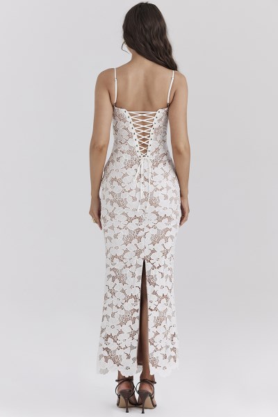 With romance in mind, our 'Pearl' maxi dress is beautifully designed with a delicate floral embroidery and lined in a luxurious cafe au lait hue for coverage and to ensure you can see the intricate details perfectly. It has supportive underwired cups and turns to reveal the gorgeous lace up back to cinch the fit in a truly feminine, vintage style. The dainty pin thin straps frame the pretty neckline and we just adore the scalloped trims for the prettiest finish. 'Pearl' zips to the side for easy on and looks so elegant paired with our 'Lola' high heels in sunkissed. The 'Regular Cup' option suits cup size A-C whilst the 'Bigger Cup' option suits cup size D-E. WHERE TO WEAR: