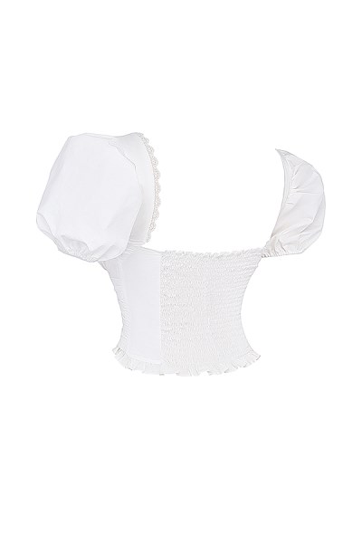 'Samaya' is perfect for Summertime events and just brimming with romance. Cut from stretch white cotton, it has a pretty gathered bust with a delicate scalloped trim and the bodice has an outer layer that pulls tight at the waist to accentuate and flatter your waist.
