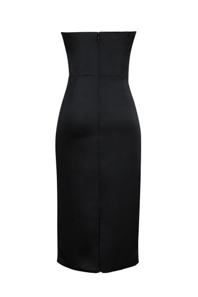 HOCB’s Santana Black strapless satin midi dress redefines elegant evening wear for your most special events. Crafted from luxurious duchess satin with a lustrous finish, Santana offers a beautifully draped, strapless fit that highlights sophistication and style. The sculpted bodice features internal corsetry and larger cup options to enhance and define the waist, providing a flattering, comfortable fit for both regular and fuller busts. Designed with a back zipper for easy on and off, this formal satin midi dress pairs effortlessly with neutral heels for a complete, refined look. Perfect for weddings, galas, and evening occasions, Santana is the ultimate choice for making a lasting impression.
